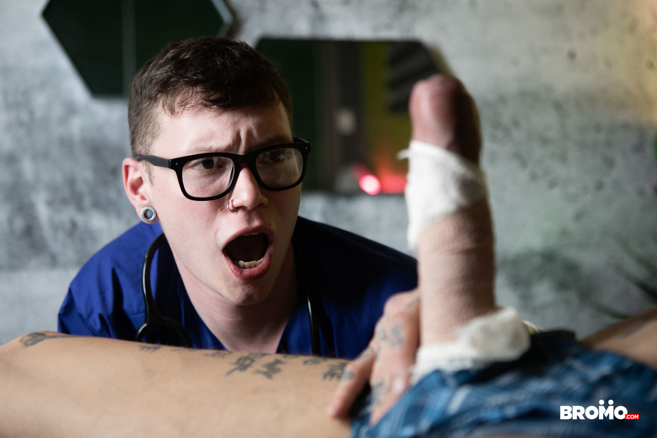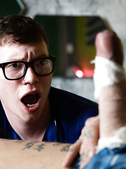 Nerdy twink Bo Sinn takes injured inked dude Marco Bianchi's cock in his ass